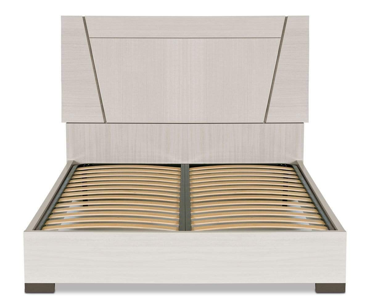 Elegant angles define the Monchiaro bed and create an instant focal point in your bedroom. The platform style bed and high headboard are constructed of a high-gloss, light grey koto wood veneer that will transform you room into an elegant oasis.Queen bed pictured.