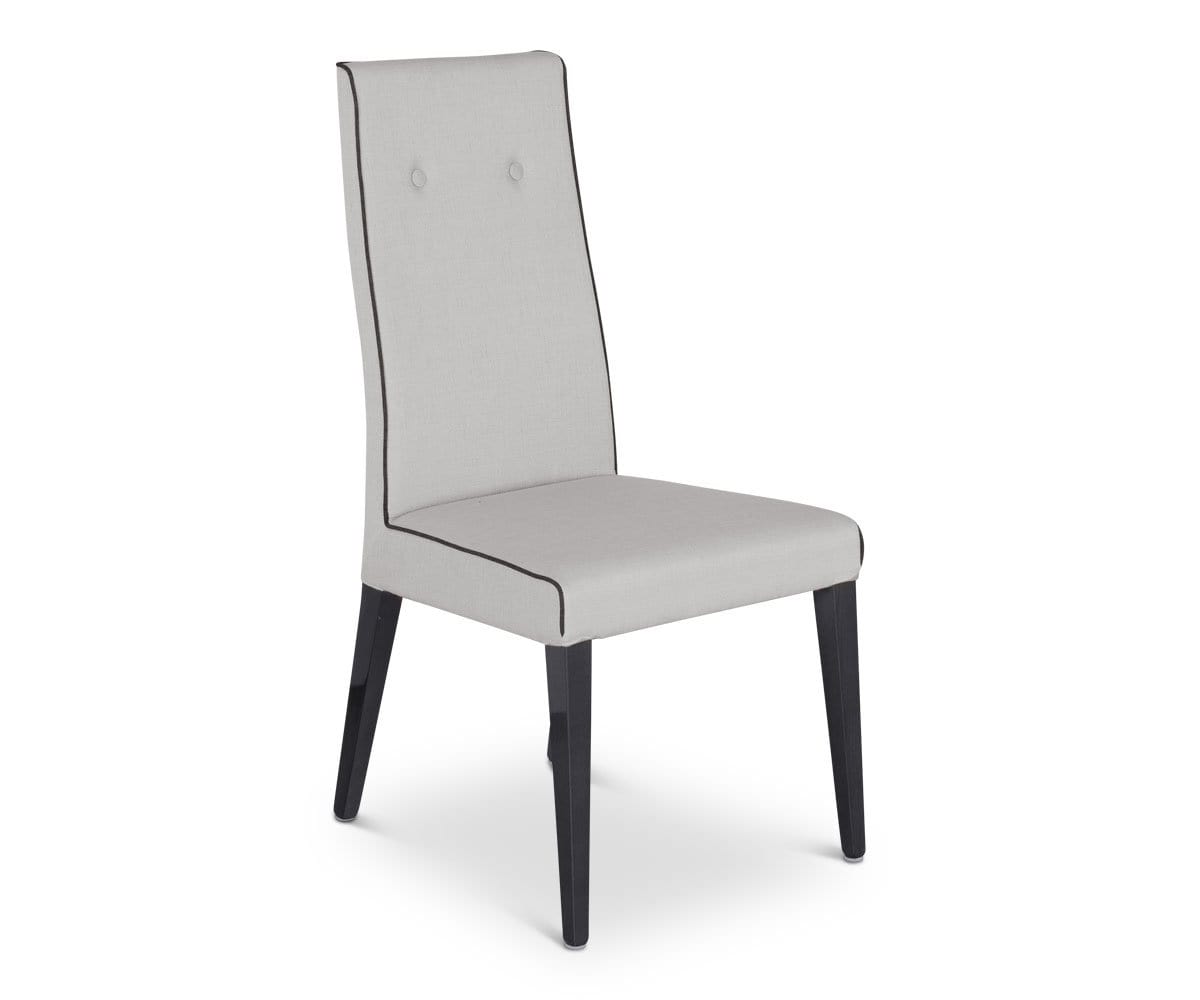 The Mondiana dining chair is upholstered in a light grey fabric with a contrasting welt that coordinates with the elegant legs constructed of grey koto veneer with a high gloss finish.