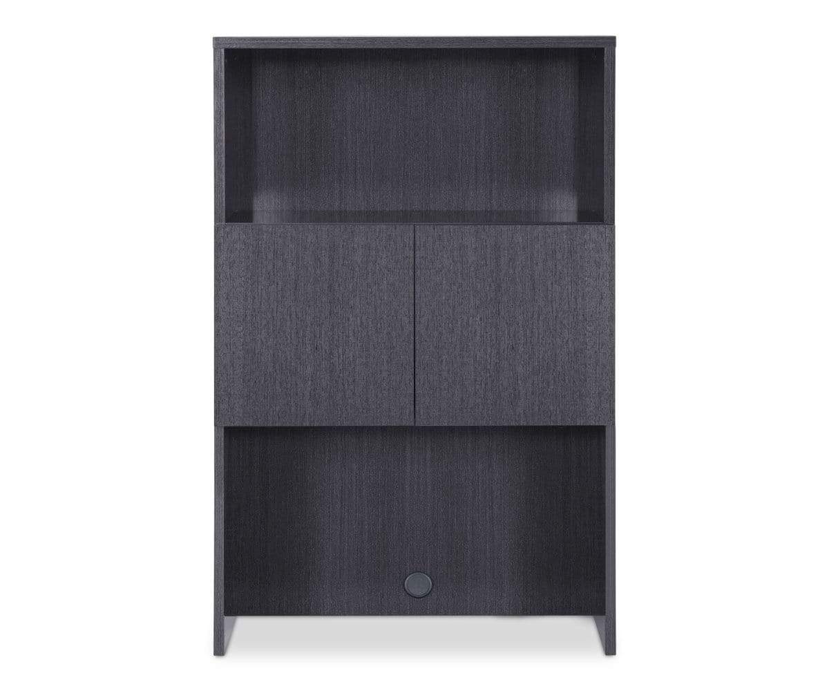 Extend your office organization with both space and style with the Mondiana lateral file hutch. With a shelf and two cabinet doors, the clean design features a high gloss finish over a striking grey koto veneer.