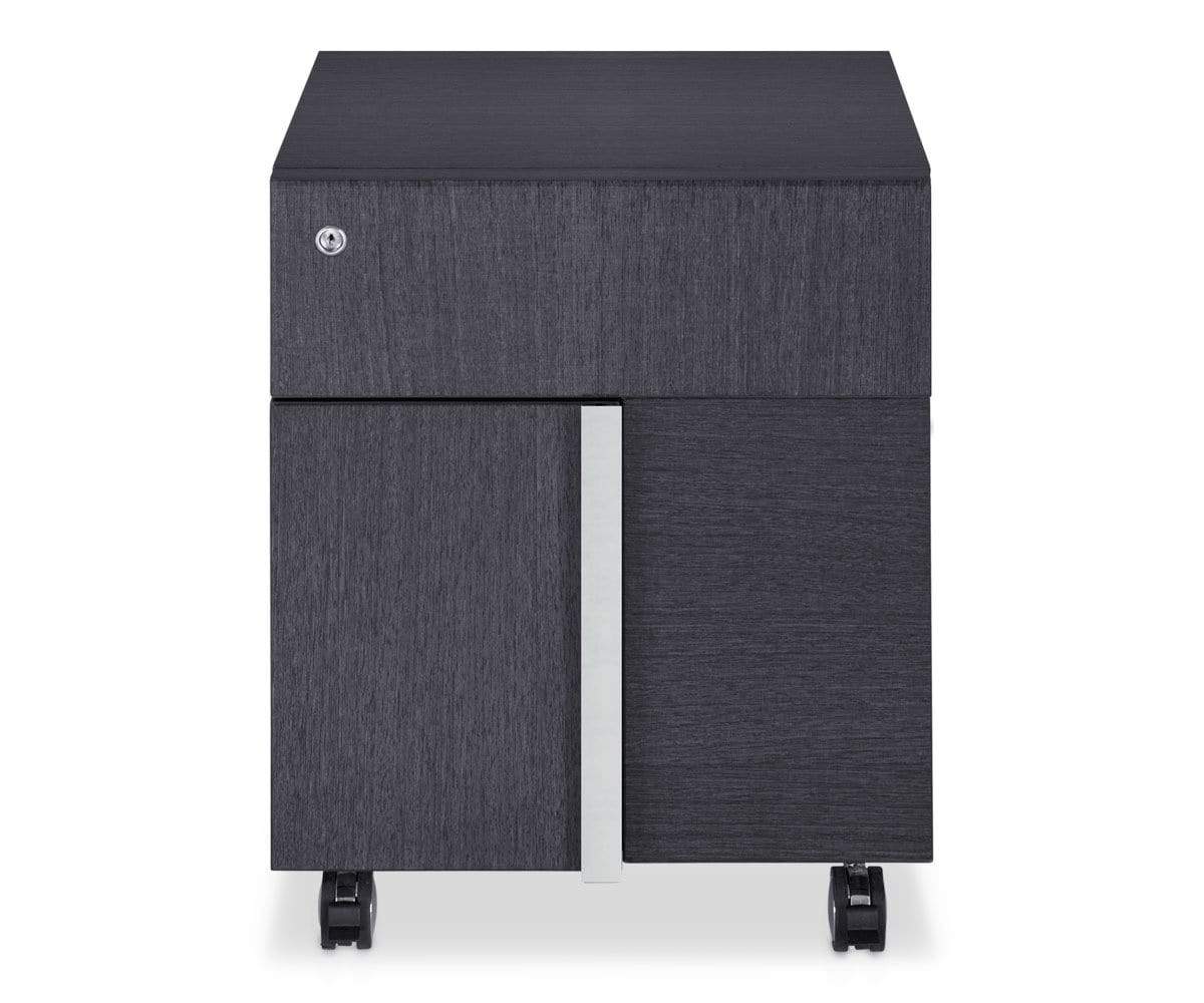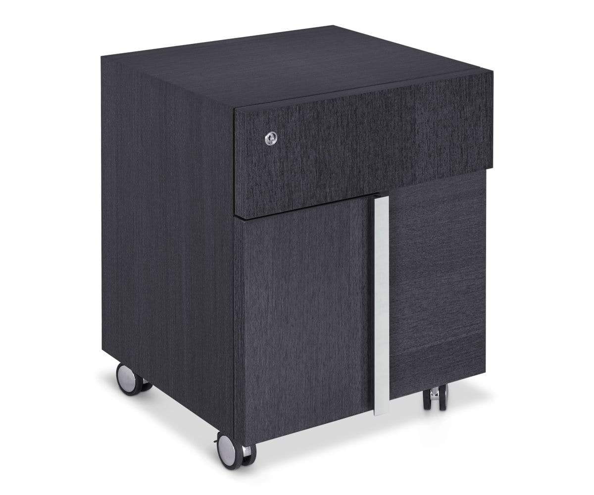 Upgrade your office aesthetic with the Mondiana mobile file pedestal. Crafted in a high gloss koto wood veneer with chrome accents, it displays a chic, modern vibe. The top drawer and lower hanging file drawer both feature a locking system and soft track closures. Casters provide mobility for your convenience.